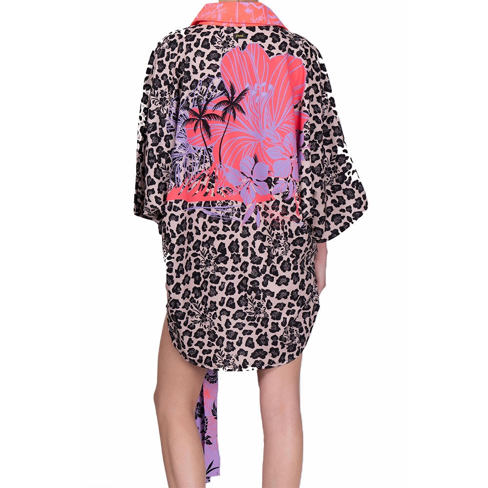 La Camicia Effek Maculata presenta manica 3/4, coulisse regolabile in vita e bottoni sulla parte anteriore.