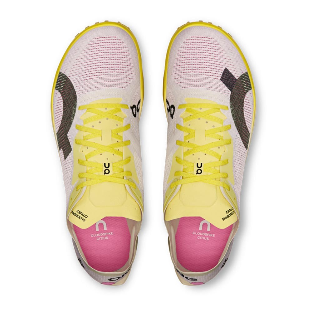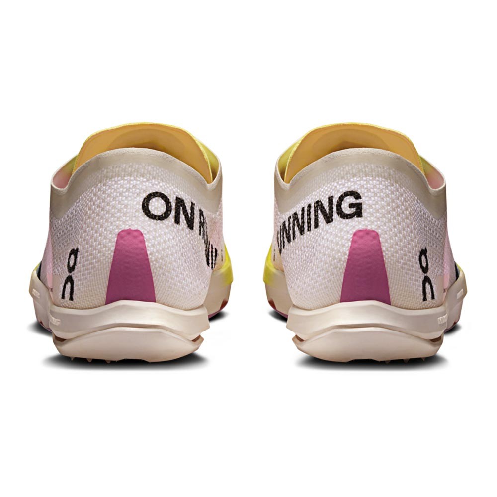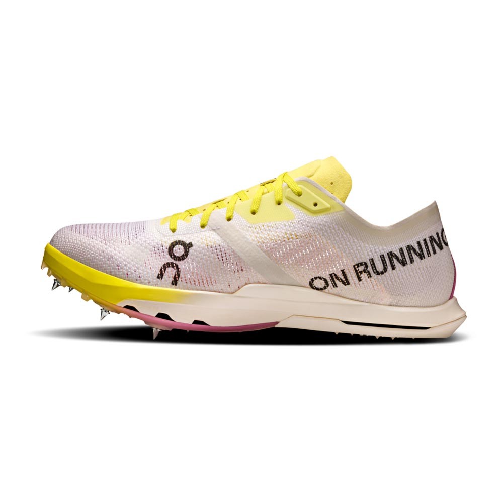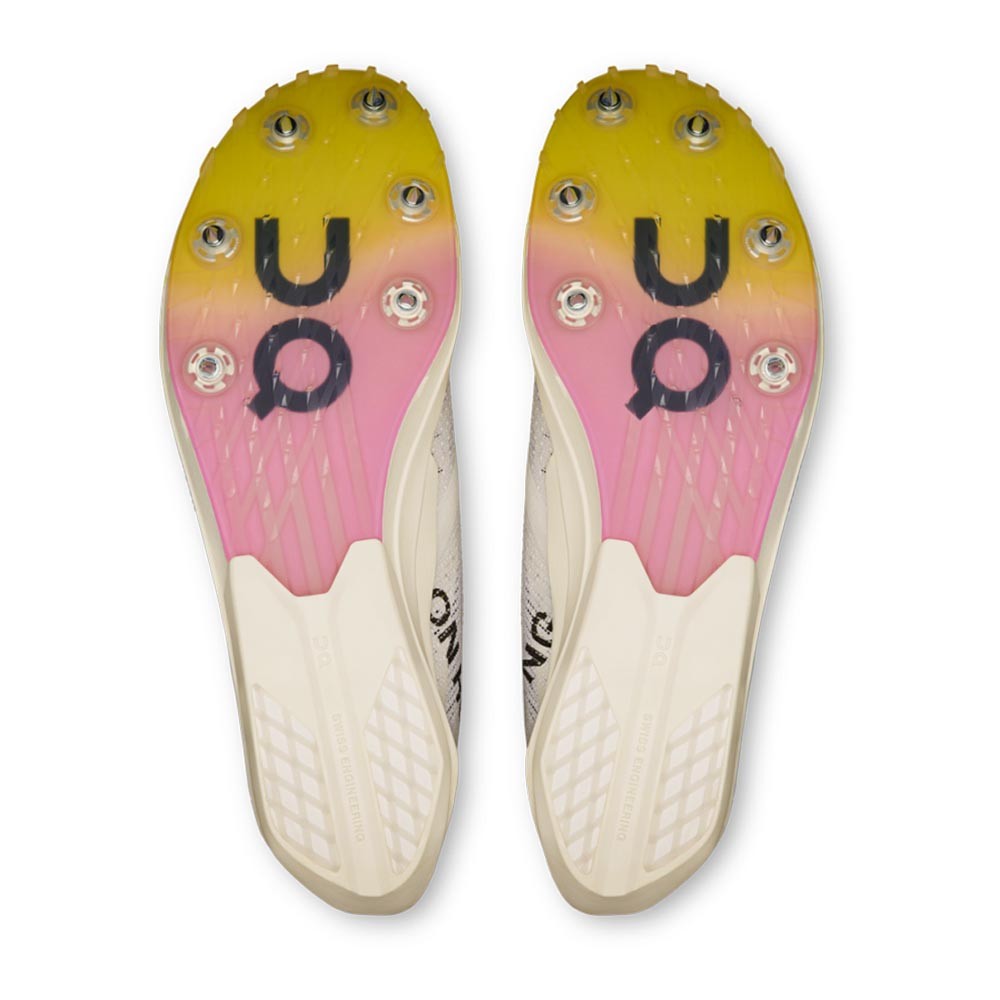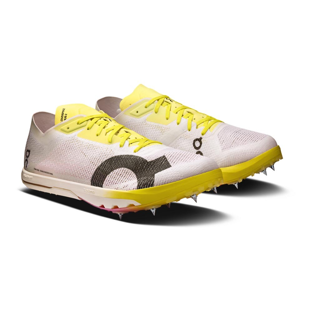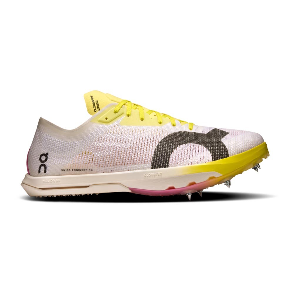 Le On Cloudspike Citius 2 in Bianco Raspberry sono progettate per le tue prestazioni più esplosive nel mezzofondo. La Speedboard® in misto nylon a mezza lunghezza garantisce stacchi potenti e una propulsione inarrestabile. L'intersuola in iperschiuma Helion™ HF assicura atterraggi morbidi e un comfort eccezionale, mentre la tomaia leggera e traspirante in un unico pezzo, realizzata in poliestere riciclato, avvolge il piede in modo stabile e sicuro. Con i suoi sei chiodini e uno stack nell'avampiede da 20 mm conforme ai regolamenti, è la scelta ideale per dominare le piste.