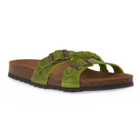 Ciabatte Bioline realizzate totalmente in Italia con tomaia in nabuk ingrassato pelle, con allacciatura a regolazione con due fibbie e intreccio. Ciabatte trekking con sottopiede anatomici che mantengono i piedi sani, gomma-sughero ricoperto in pelle e suola microporosa.
