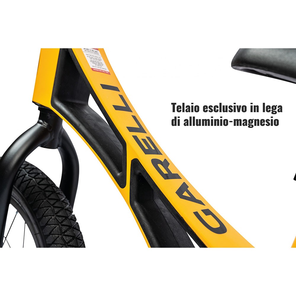La Primabici Garelli ha un manubrio a piega bassa con inclinazione regolabile, una sella regolabile con serraglio rapido a leva e delle ruote con copertone e camera d'aria da 12''.