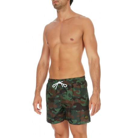Costume uomo modello boxer in microfibra, stampa fantasia militare, vita elastica con cordino regolatore, logo brand, tasca laterale, posteriore chiusura strappo.