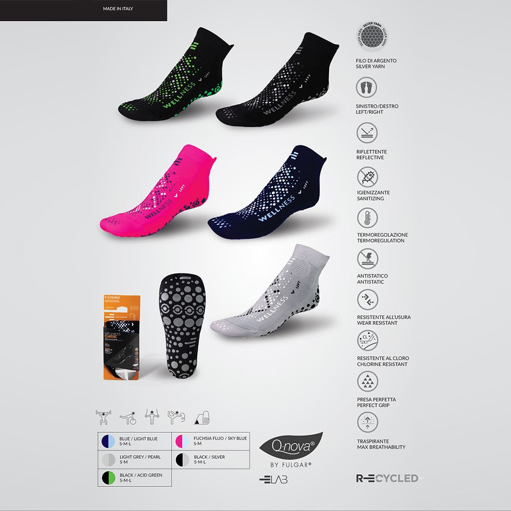 Realizzate con filato tecnico Q-NOVA® prodotto in Italia, queste calze antiscivolo palestra utilizzano nylon rigenerato proveniente dal recupero di materiali del ciclo produttivo, riducendo gli sprechi e garantendo elevati standard di qualità e tracciabilità.