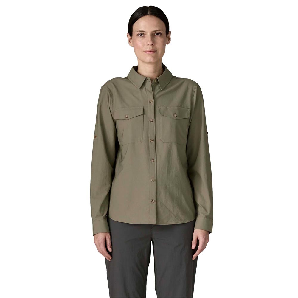 Versatile e pensata per la pesca e ogni avventura outdoor, questa camicia trekking Patagonia Self Guided donna in 100 per cento poliestere riciclato a rapida asciugatura offre protezione solare 40 UPF e libertà di movimento grazie alla lavorazione elasticizzata. Il colletto convertibile, le aperture di ventilazione su spalle e schiena, il mini panno occhiali integrato e l orlo allungato anti-marsupio completano un capo Fair Trade per ogni avventura.