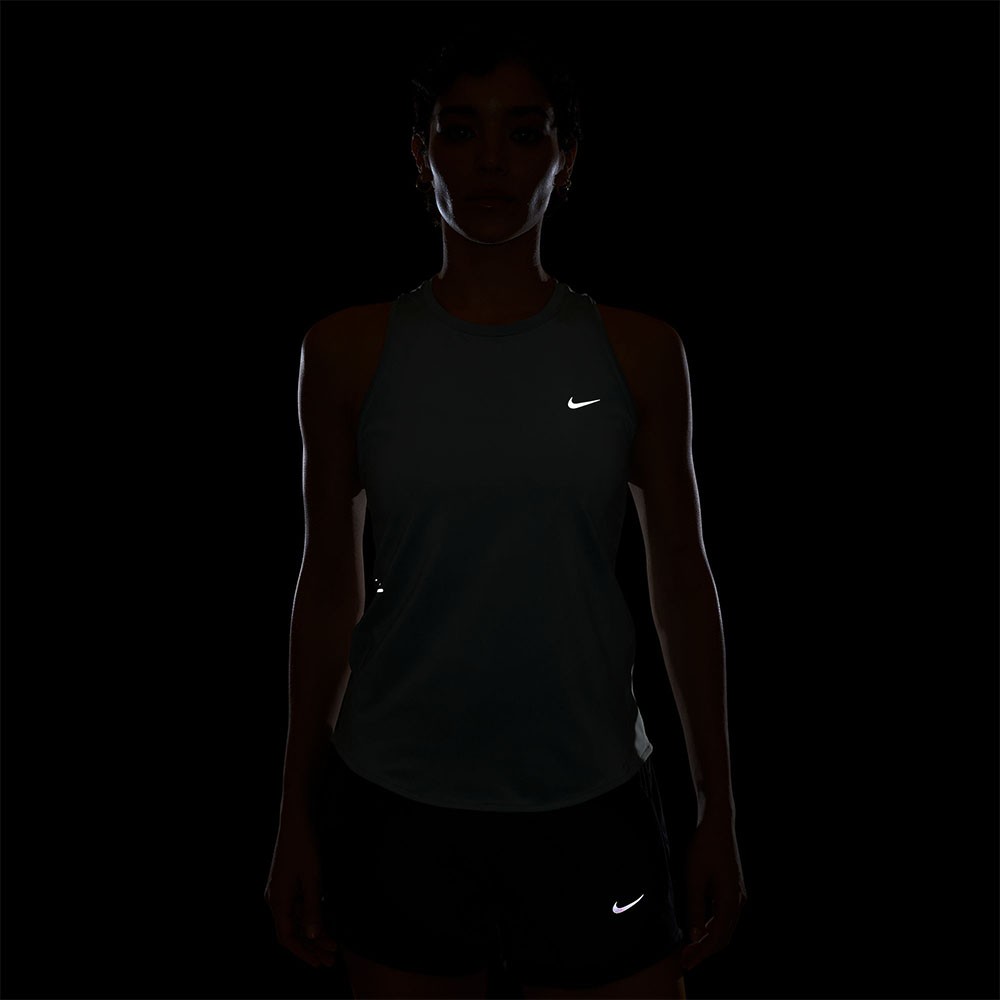 I dettagli rifrangenti assicurano visibilità in condizioni di scarsa luce, rendendo questa maglietta running tecnica un capo essenziale di abbigliamento running firmato Nike.