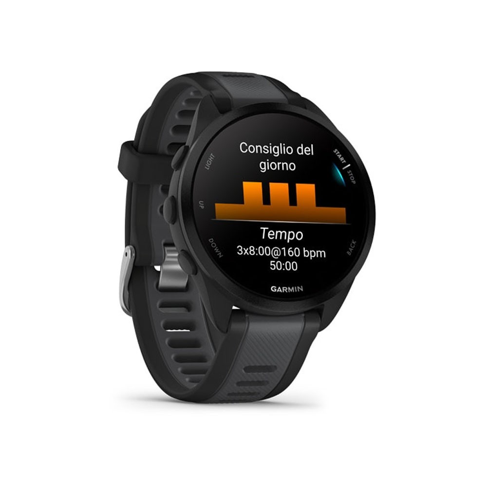 Allenati per il tuo “Personal Best” con l'orologio Garmin Forerunner® 165, progettato per i runner di qualsiasi livello. Grazie alla rilevazione dei tanti dati annessi al passo, distanza e frequenza cardiaca, vedrai i tuoi progressi sul display touchscreen AMOLED, e con i piani di allenamento Garmin Coach raggiungerai i tuoi obiettivi, che siano preparare una 10k, una mezza oppure una maratona. Già al risveglio con il report mattutino riceverai una serie di approfondimenti come una panoramica del sonno, del recupero e delle prospettive di allenamento (i dati presentati sono da intendersi come una stima accurata delle metriche monitorate) per iniziare col passo giusto la giornata. Questo orologio GPS Forerunner 165 ti indica come l’allenamento influenzi la tua forma fisica e misura il tempo di recupero per sapere quanto tempo prenderti prima del prossimo allenamento. Associa l'orologio allo smartphone e le notifiche verranno visualizzate direttamente sullo schermo; inoltre, potrai non dover slacciare il tuo Forerunner 165 dal polso fino a 11 giorni se utilizzato in modalità smartwatch.