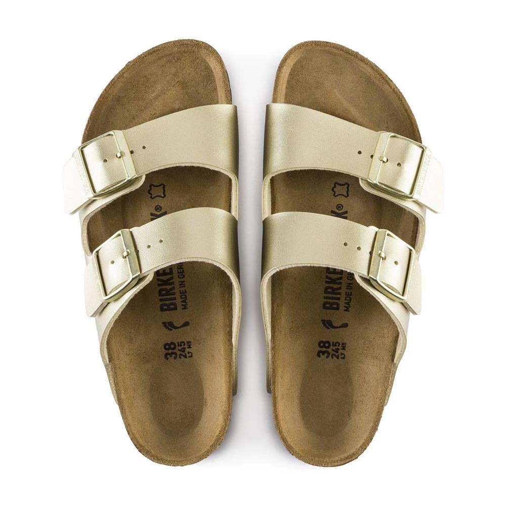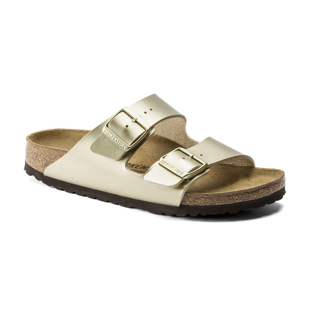Il design a due cinturini viene esaltato dalla tomaia in BirkoFlor color oro, resistente e delicata sulla pelle, e dalle fibbie in metallo coordinate che aggiungono un tocco elegante a questi Sandali Birkenstock. Il plantare anatomico in sughero e lattice regala sostegno naturale, il sottopiede in pelle scamosciata avvolge il piede, mentre la suola in EVA mantiene il sandalo leggero e ammortizzato per tutta la giornata.
