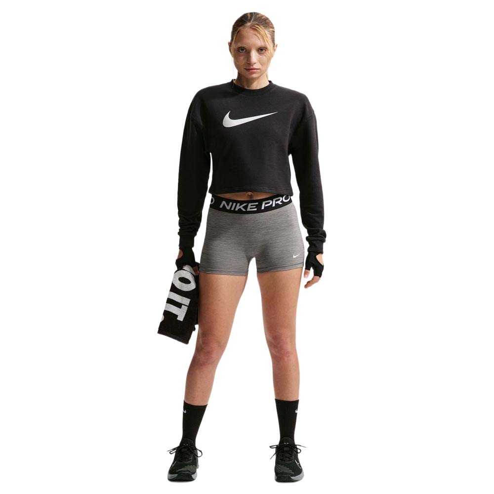La felpa palestra Nike Pro nera è un must have da palestra per chi ama i capi tecnici minimal. Il tessuto French terry di medio peso con interno ad anelli unisce calore leggero e traspirabilità, mentre la tecnologia Dri FIT allontana il sudore per un comfort costante. Il taglio corto conferisce un look moderno e funzionale, ideale da stratificare sopra top e bra per allenamenti e post workout.