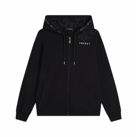 Dotata di cappuccio con coulisse regolabile e chiusura con zip, questa felpa garantisce protezione e un fit personalizzato. L'interno del cappuccio e la spalla sinistra sono arricchiti da una stampa floreale tono su tono, mentre la scritta "TRAINING" in oro chiaro lungo il bordo del cappuccio dona un tocco di eleganza. Il logo Freddy stampato sul cuore completa il design con un dettaglio distintivo.