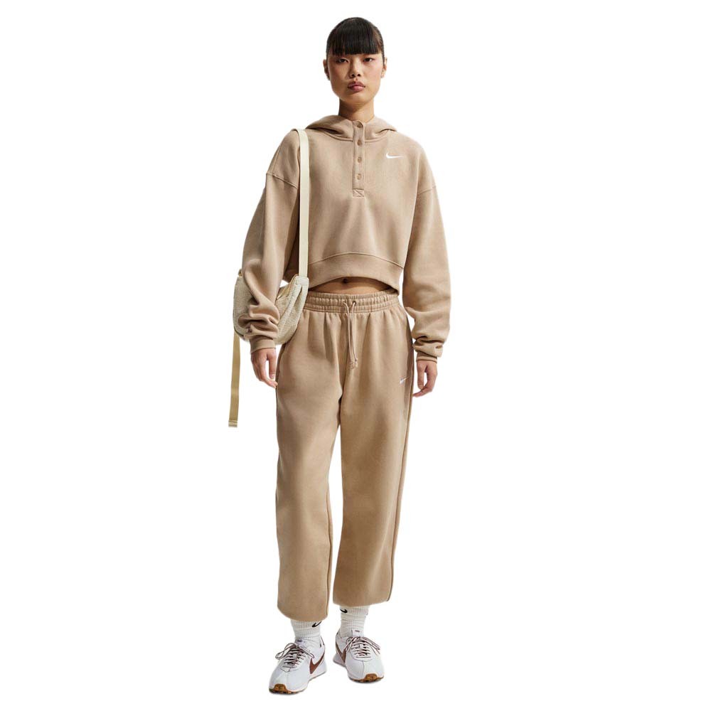 La felpa Nike Sportswear Phoenix Fleece crop verde unisce spalle scese, fit extra ampio e taglio corto per un look squadrato di forte impatto. Il fleece spazzolato di peso medio è ultramorbido all’interno e liscio fuori, mentre il design con bottoni a serafino regala una finitura pulita e versatile. Polsini e bordo a costine, cappuccio e logo ricamato completano una felpa perfetta per il loungewear e la città.