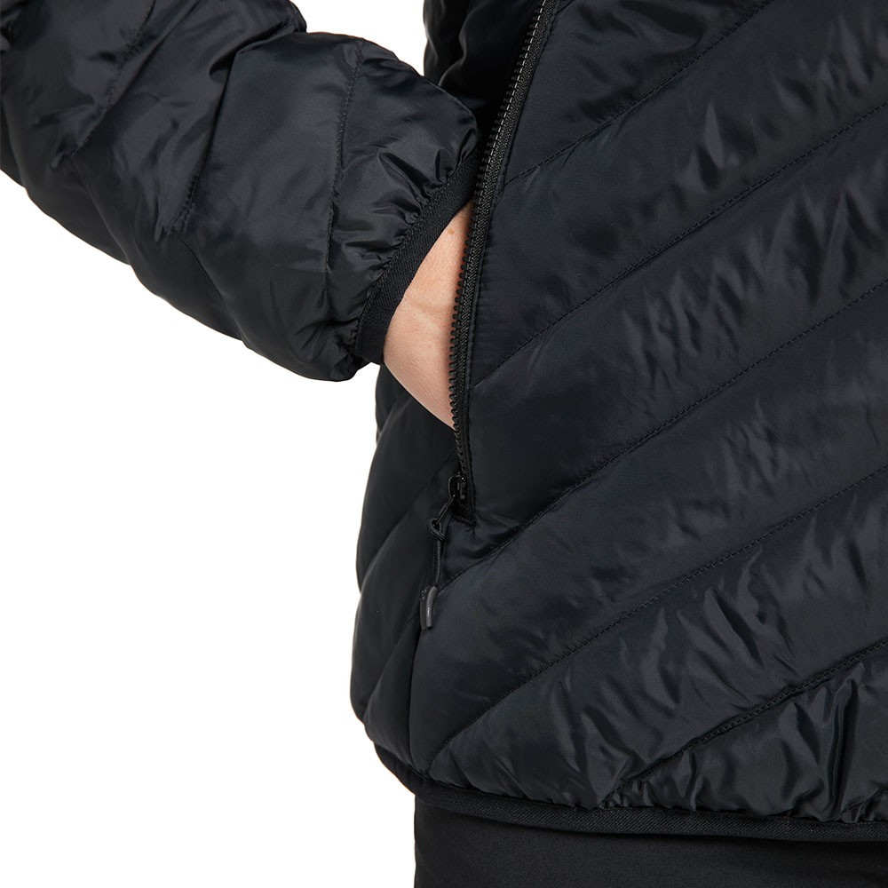Il tessuto esterno in poliestere riciclato con trattamento DWR privo di fluorocarburi protegge da vento e umidità, mentre il design trapuntato obliquo dona un look moderno e distintivo. Il cappuccio isolato, i polsini e l’orlo elasticizzati trattengono il calore, mentre la zip frontale con patta interna aumenta l’isolamento.