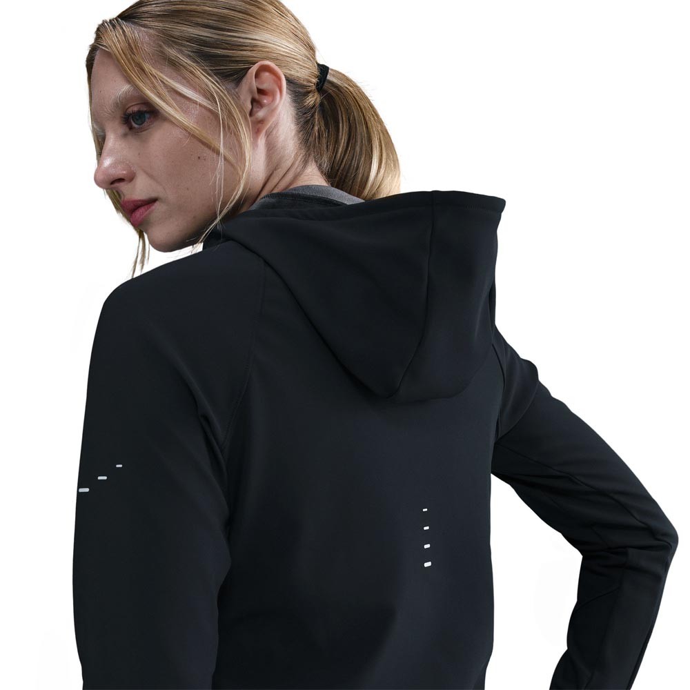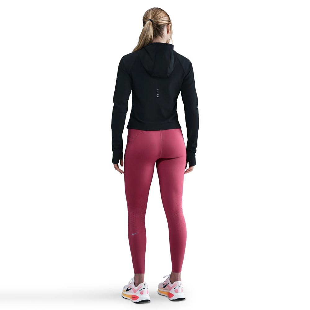 Il tessuto termico con tecnologia Therma-FIT di questa giacca running gestisce il calore naturale del corpo per mantenere una temperatura ideale, mentre la finitura idrorepellente sullo strato liscio esterno ti protegge dalla pioggia leggera senza appesantire la corsa. La vestibilità su misura riduce le distrazioni, gli occhielli per il pollice aumentano la copertura, le tasche in mesh con zip custodiscono gli essenziali con leggerezza e il cappuccio presenta un’apertura dedicata per la coda di cavallo, con zip a due vie e dettagli rifrangenti che completano il look.