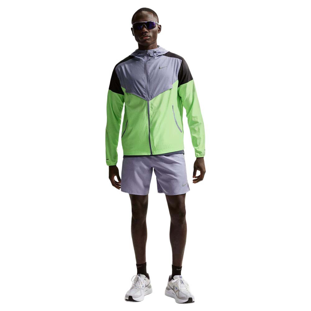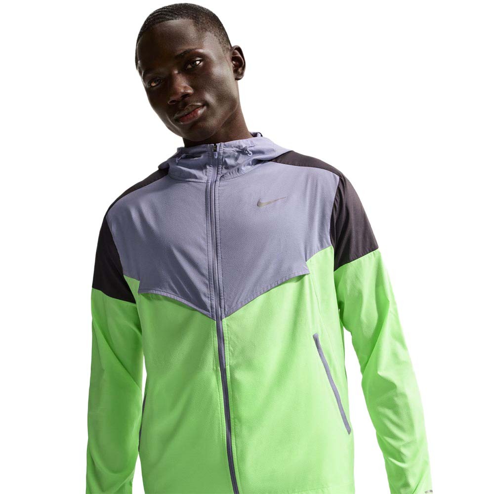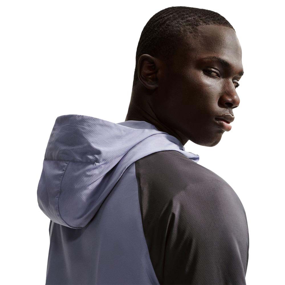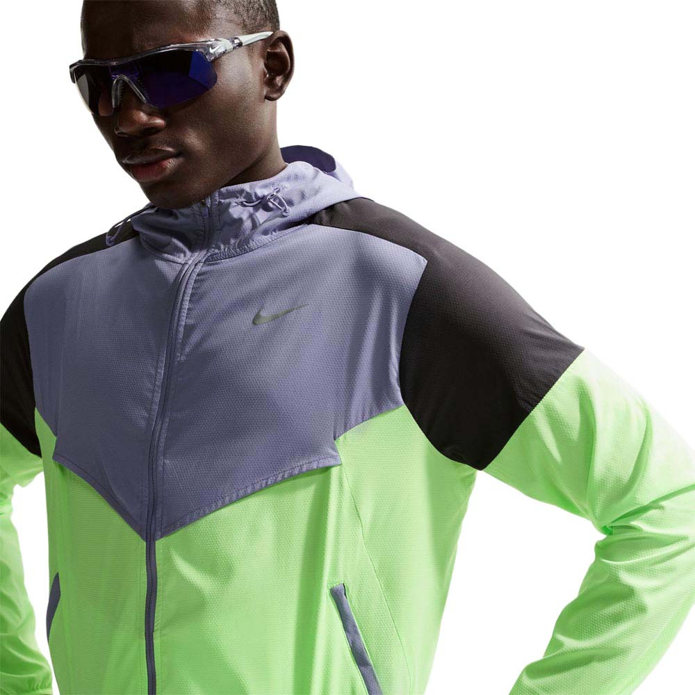 Il tessuto in poliestere ed elastan è traspirante, idrorepellente e blocca i raggi UVA e UVB sulle aree coperte, mentre lo spacchetto sul retro migliora il flusso d’aria in movimento. La giacca running Nike si ripiega nella tasca interna nascosta per essere portata ovunque, le tasche con zip tengono al sicuro gli essenziali e la zip a tutta lunghezza con cappuccio regolabile permette di modulare rapidamente la copertura, con linee a V ispirate alla Windrunner del 1978.