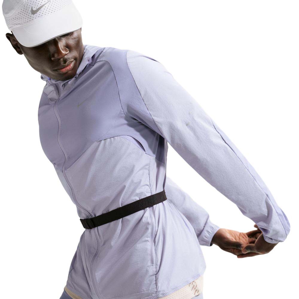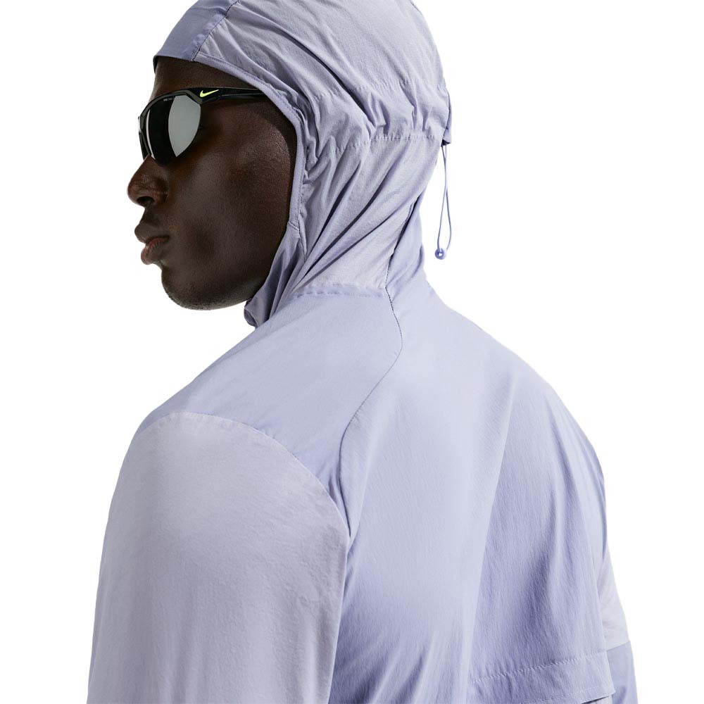 La costruzione in nylon e spandex con finitura idrorepellente di questa Giacca running Nike protegge dall’umidità, mentre l’inserto sul petto offre protezione UV nelle aree coperte e il tessuto leggero limita l’ingombro in corsa. Gli inserti foderati in mesh aumentano il ricambio d’aria, le tasche con zip permettono di portare con te gli essenziali e il cappuccio regolabile assicura copertura personalizzata, completato da dettagli rifrangenti neri.