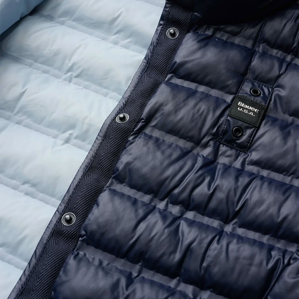 Pensato per affrontare le condizioni meteo più impegnative, questo piumino Blauer Moon donna combina tecnologia termosaldatura e design femminile per un risultato caldo e impermeabile. Il cappuccio protegge da vento e pioggia, mentre la chiusura con bottoni aggiunge un tocco elegante e originale. Un piumino versatile e affidabile per ogni attività all aperto in pieno stile Blauer.