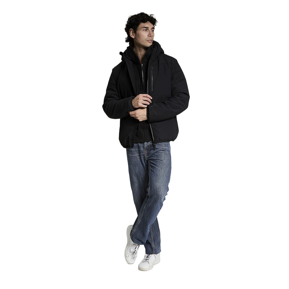 L’effetto opaco del tessuto tecnico valorizza il design moderno, creando un contrasto elegante con la zip frontale a “denti di squalo” con doppio cursore e con la zip spalmata della pratica tasca a petto. Le due tasche laterali con zip invisibile contribuiscono a un look minimal e fashion.