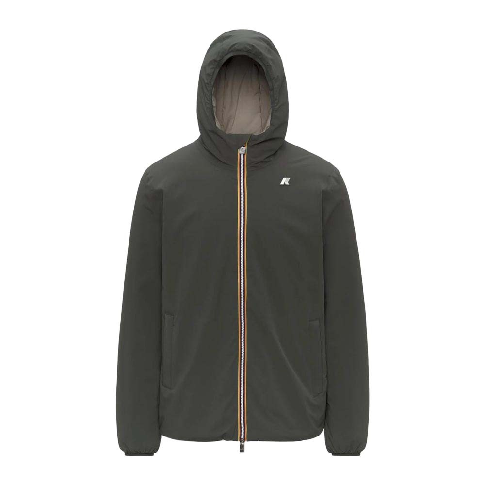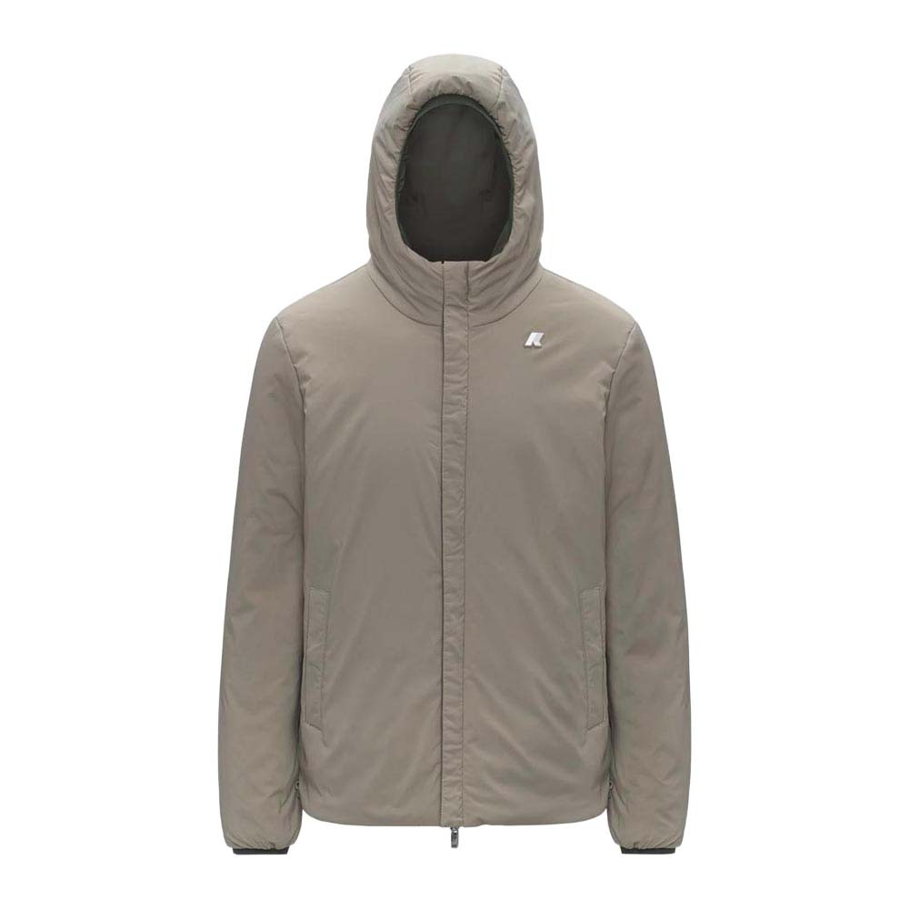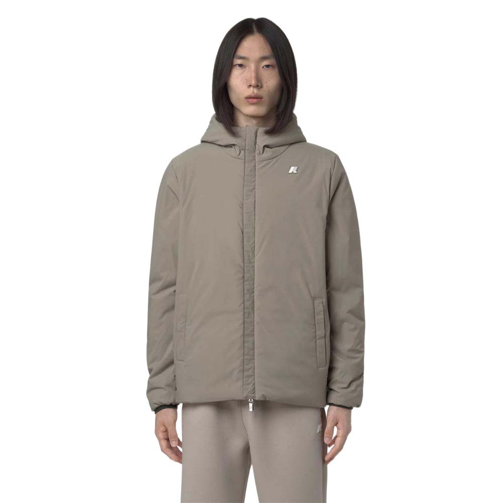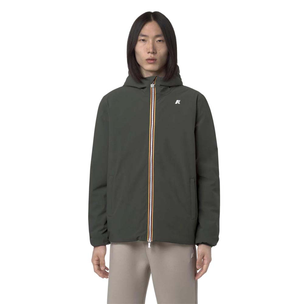 La giacca K-Way Jack è un capo versatile e performante. Il suo design reversibile offre due look in uno: un lato in poliestere elasticizzato impermeabile, l'altro in poliestere antivento. L'imbottitura in ovatta assicura un calore medio, perfetto per la mezza stagione. Le cuciture termonastrate e il tessuto traspirante garantiscono comfort e protezione durante le attività outdoor. Il fit slim e il cappuccio regolabile completano il design.