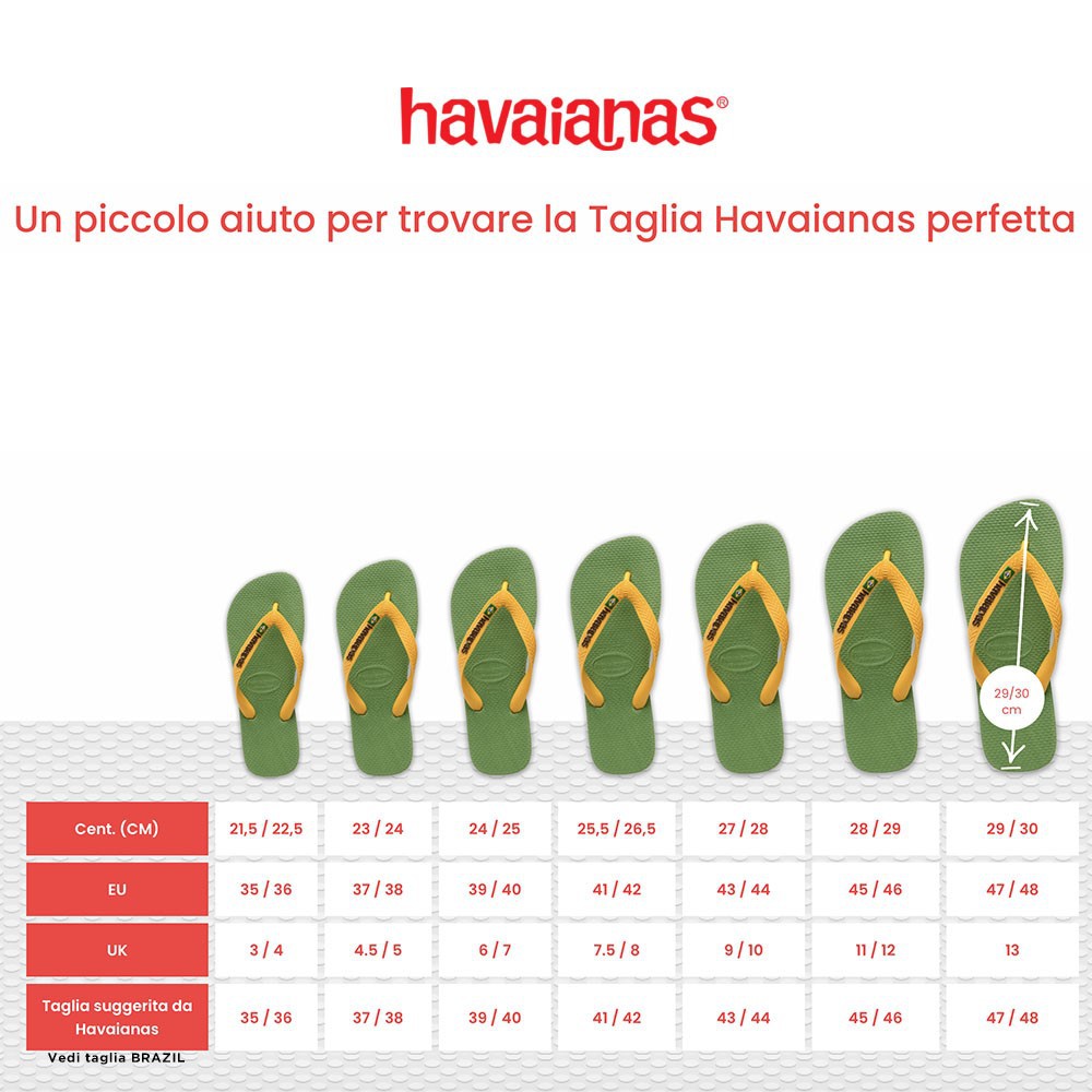 Le taglie Havaianas possono creare confusione perché la misura visibile sotto il tallone, vicino al logo stampato in grande, è la taglia brasiliana (BR), che non corrisponde alla nostra abituale taglia europea (EUR).