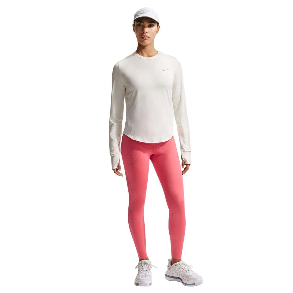 La tecnologia Nike Dri-FIT di questi Leggings running Nike gestisce il sudore, mentre gli inserti traforati dietro il ginocchio aiutano a disperdere il calore in eccesso. L’assenza di cuciture nella parte interna della gamba limita gli sfregamenti, la vita alta con laccetto interno garantisce sostegno regolabile, la tasca posteriore con zip in vita custodisce lo smartphone e le tasche laterali aperte accolgono gel e accessori, completate da grafica rifrangente sulla coscia per maggiore visibilità.