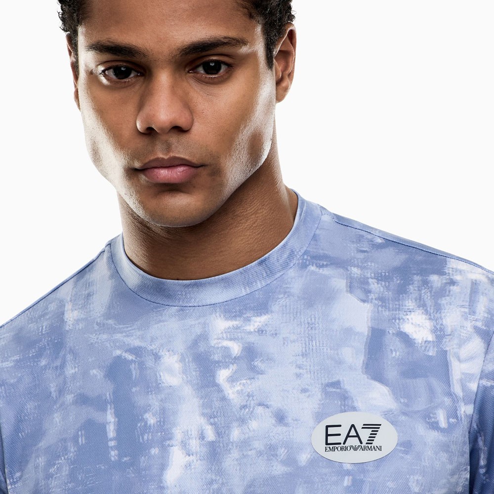 Questa t-shirt tennis uomo presenta una linea pulita con girocollo e maniche corte, arricchita da una stampa all over che richiama i temi distintivi della collezione. Il logo EA7 a contrasto sul petto completa il look con un tocco sportivo e deciso.
