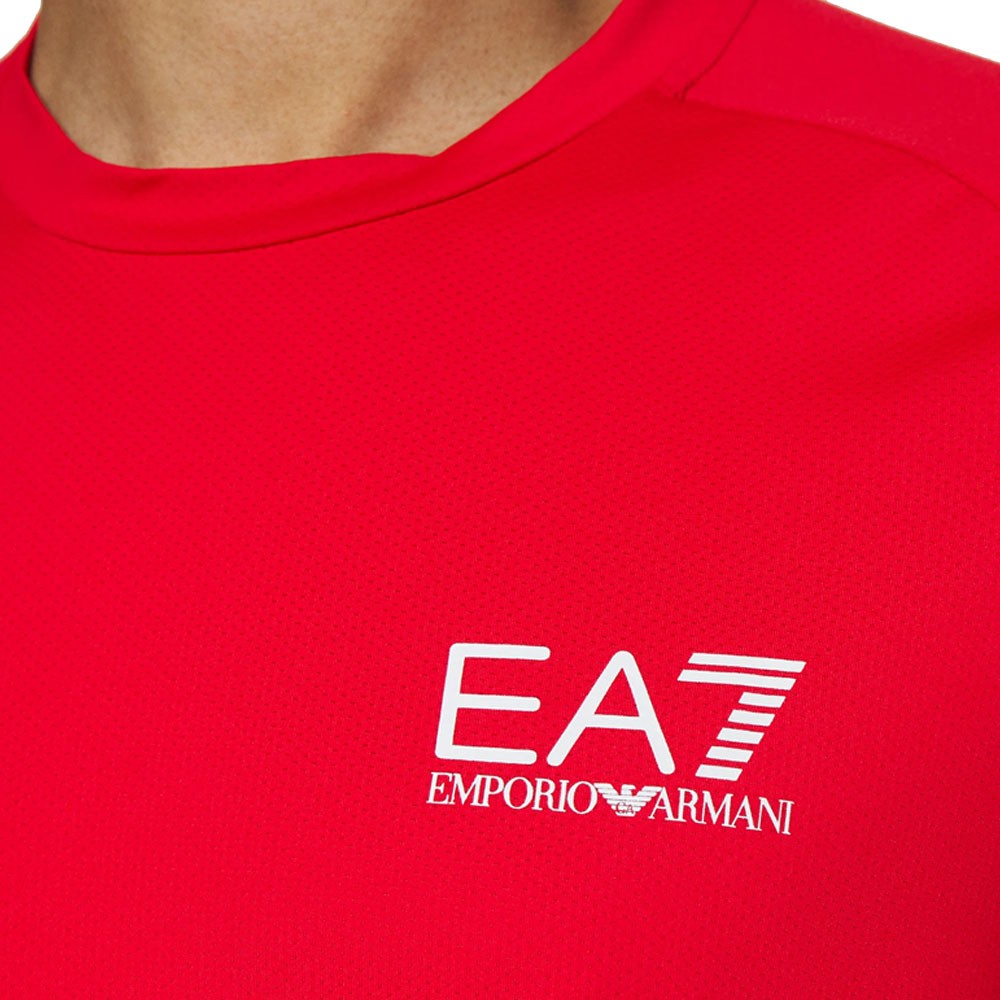 T-Shirt Tennis Ea7 Ventus 7 Rosso Uomo realizzata in tessuto tecnico VENTUS7, che assicura a questa t-shirt EA7 performance ottimali grazie all'alta traspirabilità del tessuto, che aiuta a mantere la temperatura corporea a un livello ottimale. Questo modello di maglia tennis, personalizzato con il logo a contrasto sul petto e dall'iconico logo Eagle, è perfetto da abbinare ai joggers e shorts di collezione EA7.