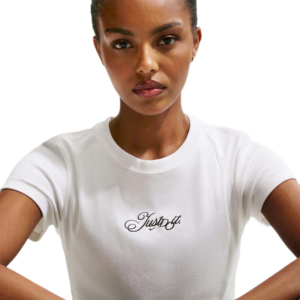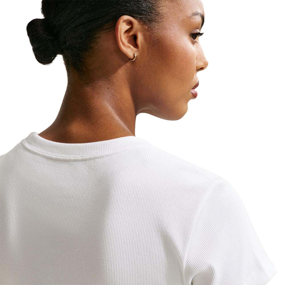 Semplice essenziale e sempre alla moda, la T-Shirt Crop Nike Sportswear donna Bianco in 94 per cento cotone e 6 per cento spandex con tessuto a costine morbido e leggero offre un fit aderente e un taglio corto ideale per outfit casual contemporanei. Il collo a costine la grafica stampata e la tonalità bianca versatile che si abbina a tutto completano un capo quotidiano femminile di qualità.
