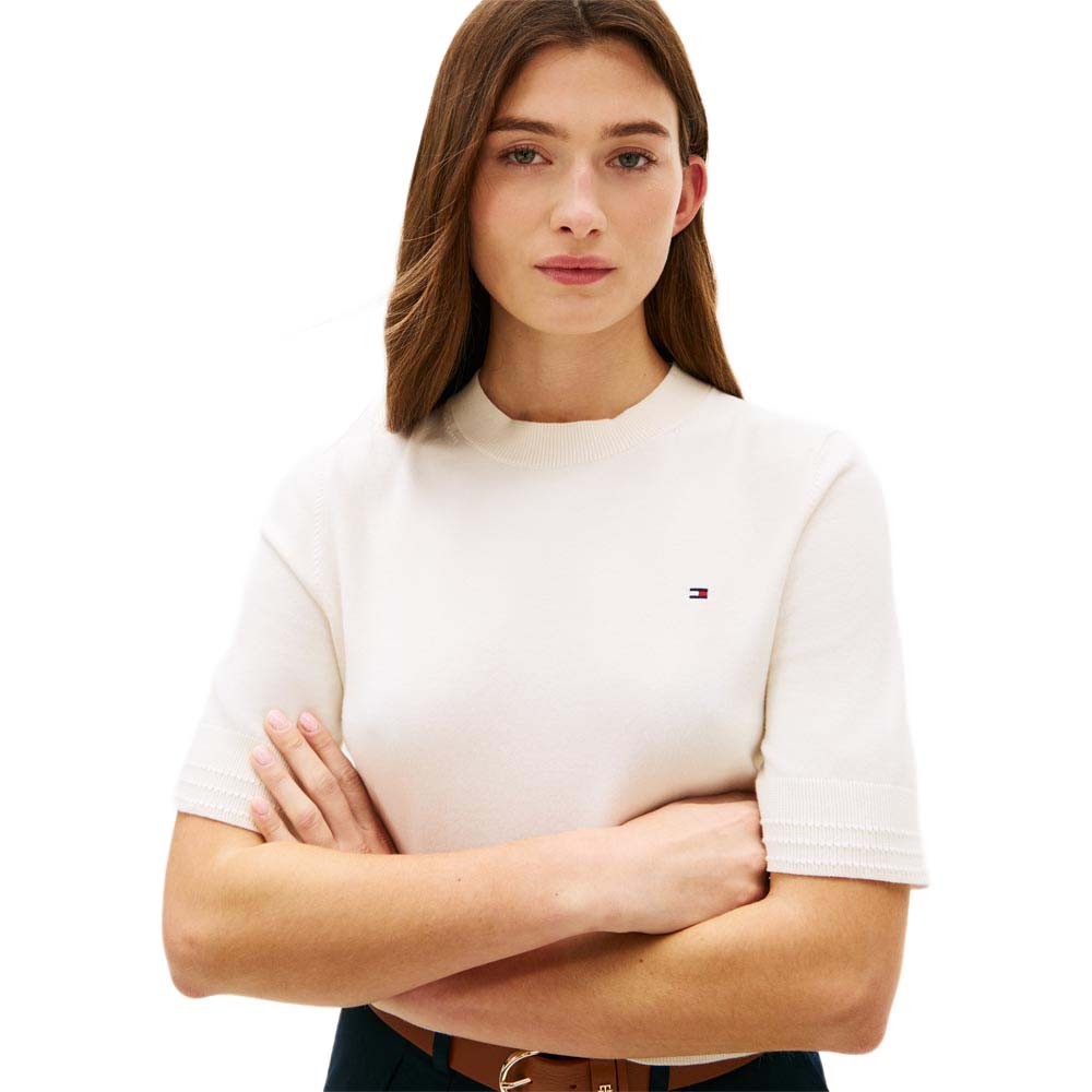 Perfetta per completare look casuali di qualità, questa t shirt Tommy Hilfiger in maglia in tonalità bianca offre morbidezza e una texture lavorata che la distingue da una semplice t shirt basic. Il bianco pulito si abbina a qualsiasi outfit, mentre la lavorazione in maglia aggiunge un tocco di eleganza discreta per look casual e smart casual.