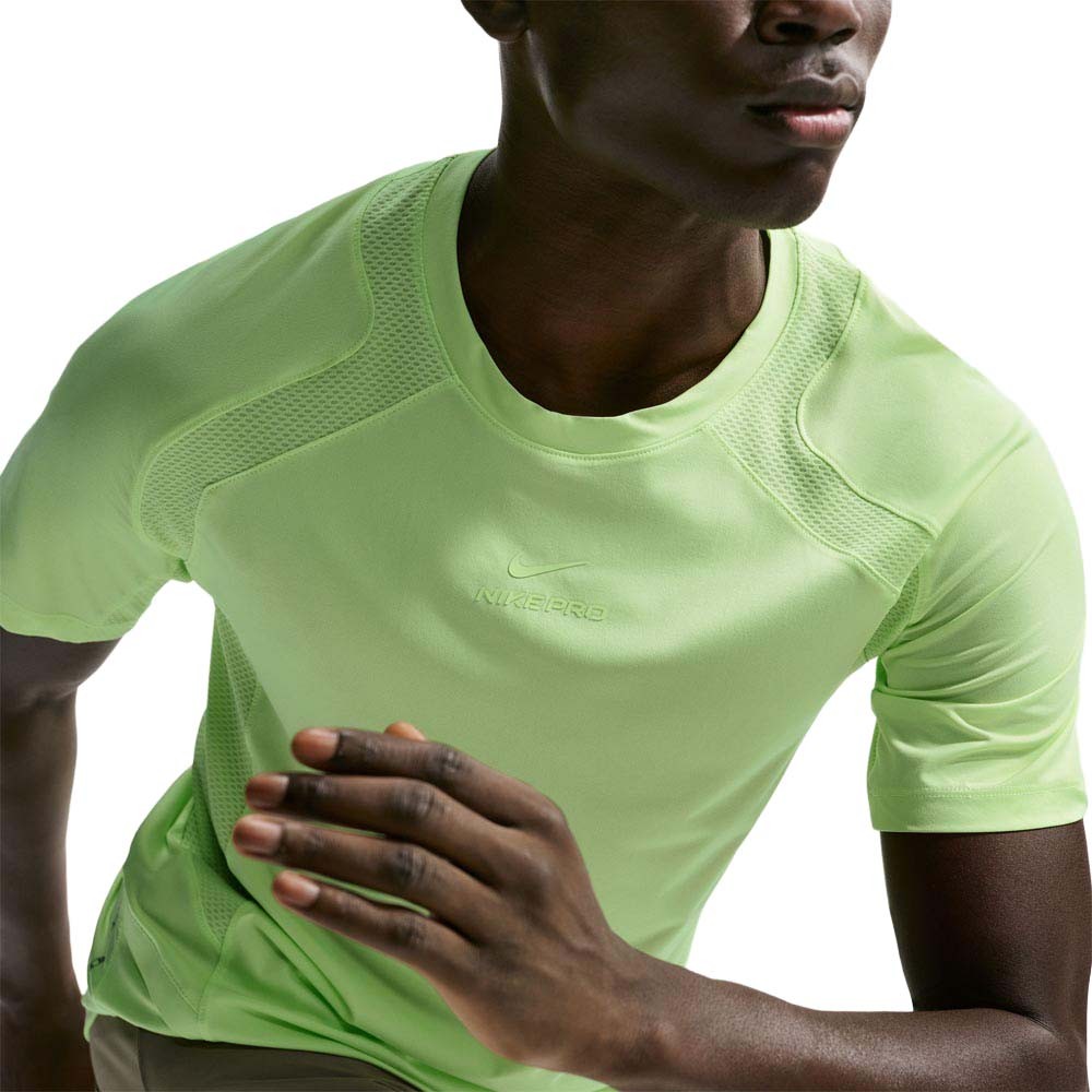 Nike Pro Training Maglia a manica corta Dri-FIT ADV – Uomo La maglia Nike Pro è progettata per gli allenamenti più intensi, grazie al fit avvolgente con cuciture ultraresistenti che offre la massima libertà di movimento. La tecnologia Dri-FIT avanzata e gli inserti in mesh donano una freschezza ideale, così potrai mantenere la massima concentrazione sui tuoi obiettivi. Nike Dri-FIT ADV perfeziona la nostra tecnologia traspirante per offrire una freschezza totale e zone di traspirabilità che mantengono la pelle asciutta. Il tessuto leggero offre una sensazione di morbidezza sulla pelle. Gli inserti in mesh sulla parte anteriore delle spalle, nel giromanica e sul retro donano una freschezza ideale nelle zone più soggette a sudorazione. Le cuciture termosaldate offrono maggiore resistenza, così potrai eseguire sollevamenti e stretching nel massimo comfort. Il bordo arrotondato riduce le distrazioni evitando le arricciature. La tasca aperta sul lato destro è perfetta per riporre i piccoli oggetti indispensabili. More Details Slim fit Grafica con marchio "Nike Pro" sul petto 100% poliestere Lavabile in lavatrice Prodotto importato