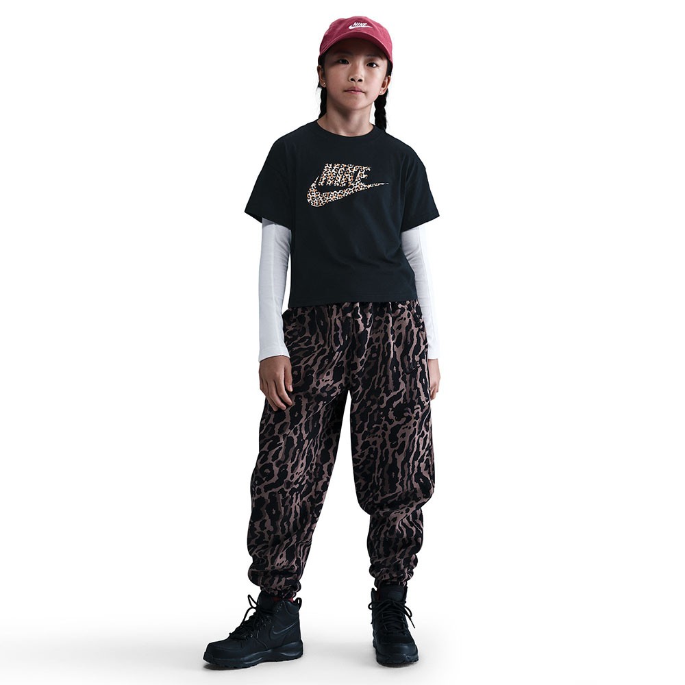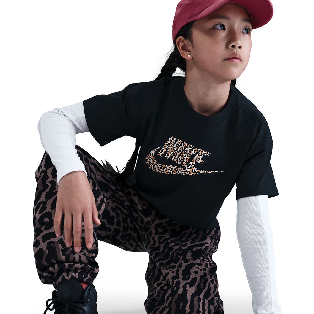 Nike Sportswear Big Kids' (Girls') T-Shirt Cut with a little more room and all the classic Nike comfort you expect, this cotton tee is perfect for everyday wear. Designed with a loose fit and a relaxed vibe. Midweight cotton is perfect for 24/7 wearability. Animal print Swoosh logo reminds you your inner athlete can't be tamed. More Details 100% cotton Machine wash Imported