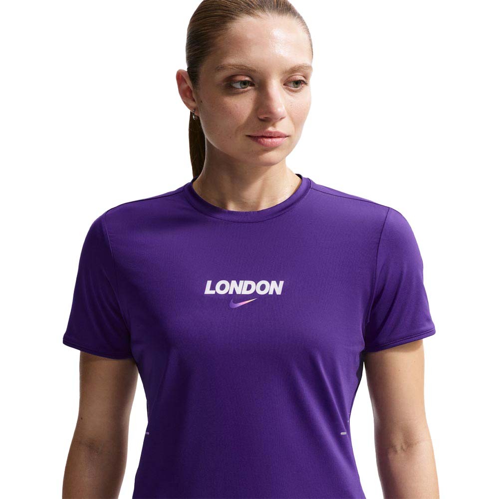 Affrontare le strade londinesi e ogni percorso urbano con la massima freschezza con la Maglia Running Nike Swift London donna Court Purple in 88 per cento poliestere e 12 per cento spandex con mesh 100 per cento poliestere e tecnologia Dri-FIT. Le maniche a raglan modificate riducono le irritazioni e aumentano la libertà di movimento, mentre il grande pannello in mesh sul retro e i dettagli rifrangenti completano un top running leggero e performante.