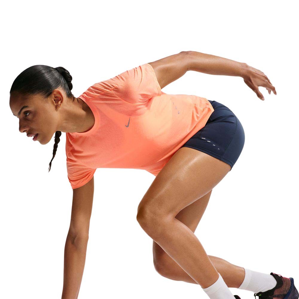 Sempre pronta per correre con la Maglia Running Nike Swift Breathe donna Arancio Pulse in 100 per cento poliestere con tecnologia Dri-FIT. Il tessuto ultraleggero e liscio offre traspirabilità con copertura leggera per una sensazione fresca a ogni passo, mentre i dettagli rifrangenti completano un top essenziale per chi ama correre con stile e visibilità in qualsiasi momento.