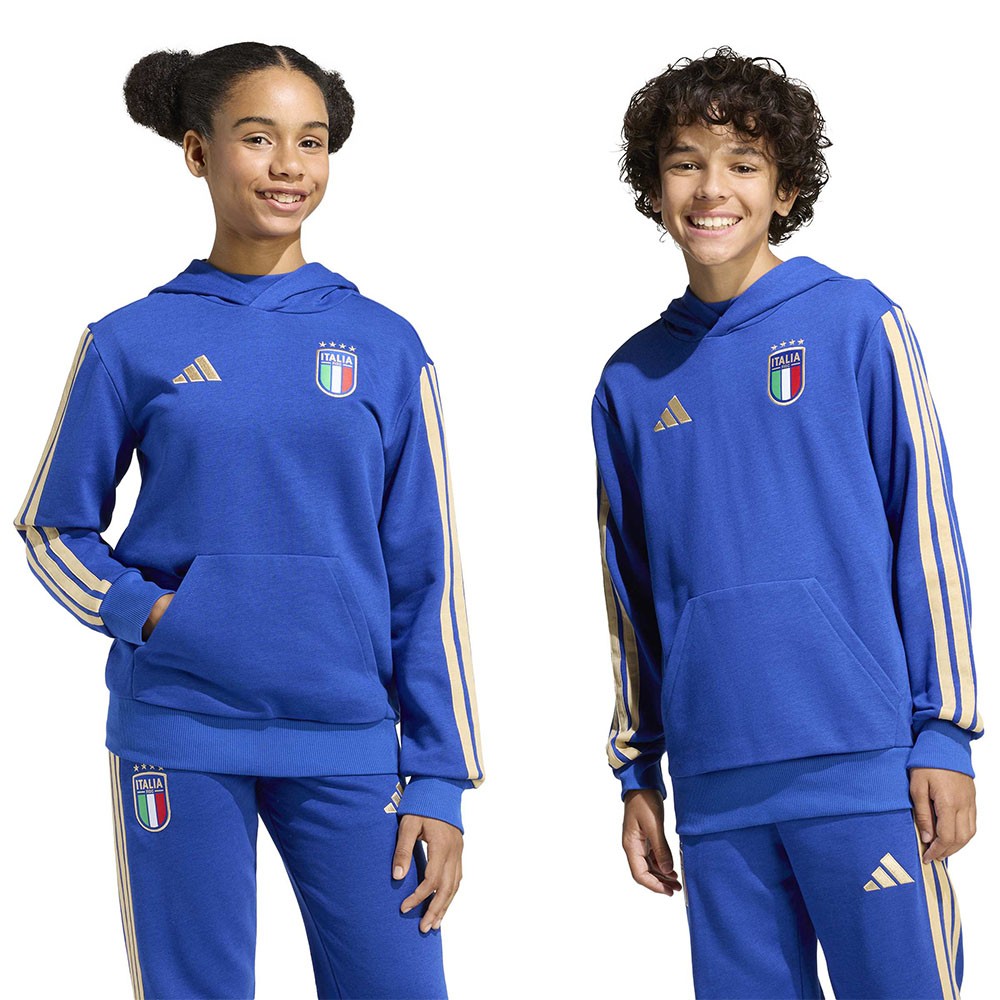 Con un design ispirato al mondo del calcio, questa felpa con cappuccio offre un look sportivo perfetto per scuola, gioco o match day. Il logo ADIDAS e lo stemma FIGC aggiungono un tocco iconico.