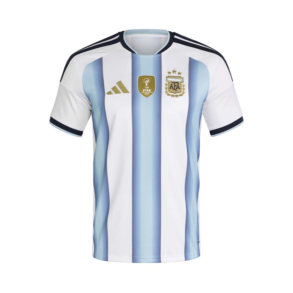 Ispirata alle leggendarie vittorie dell'Argentina nel '78, '86 e '22, questa maglia celebra una storia gloriosa. Il design riprende i colori delle tre coppe del mondo, con dettagli raffinati e l’anno di fondazione della federazione.