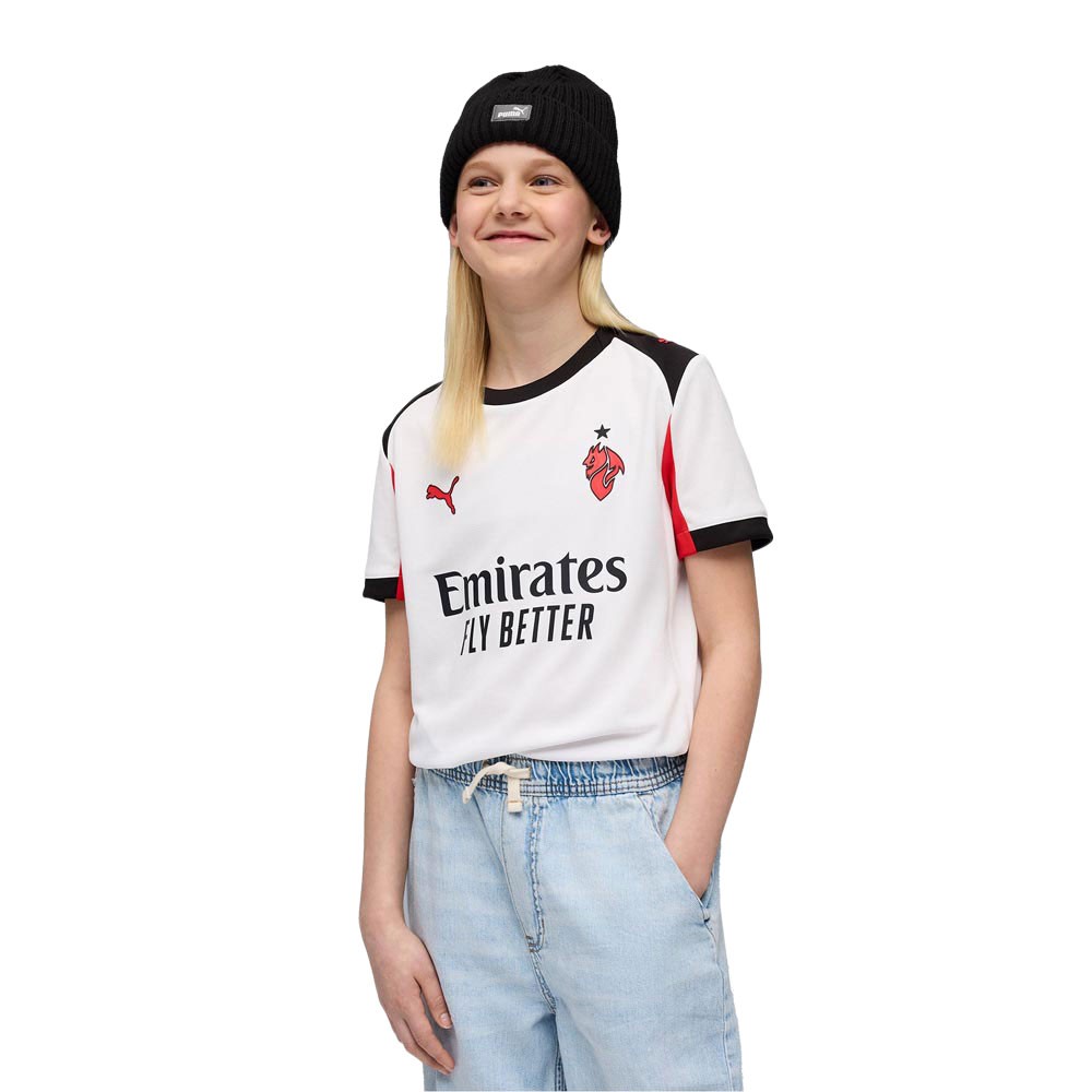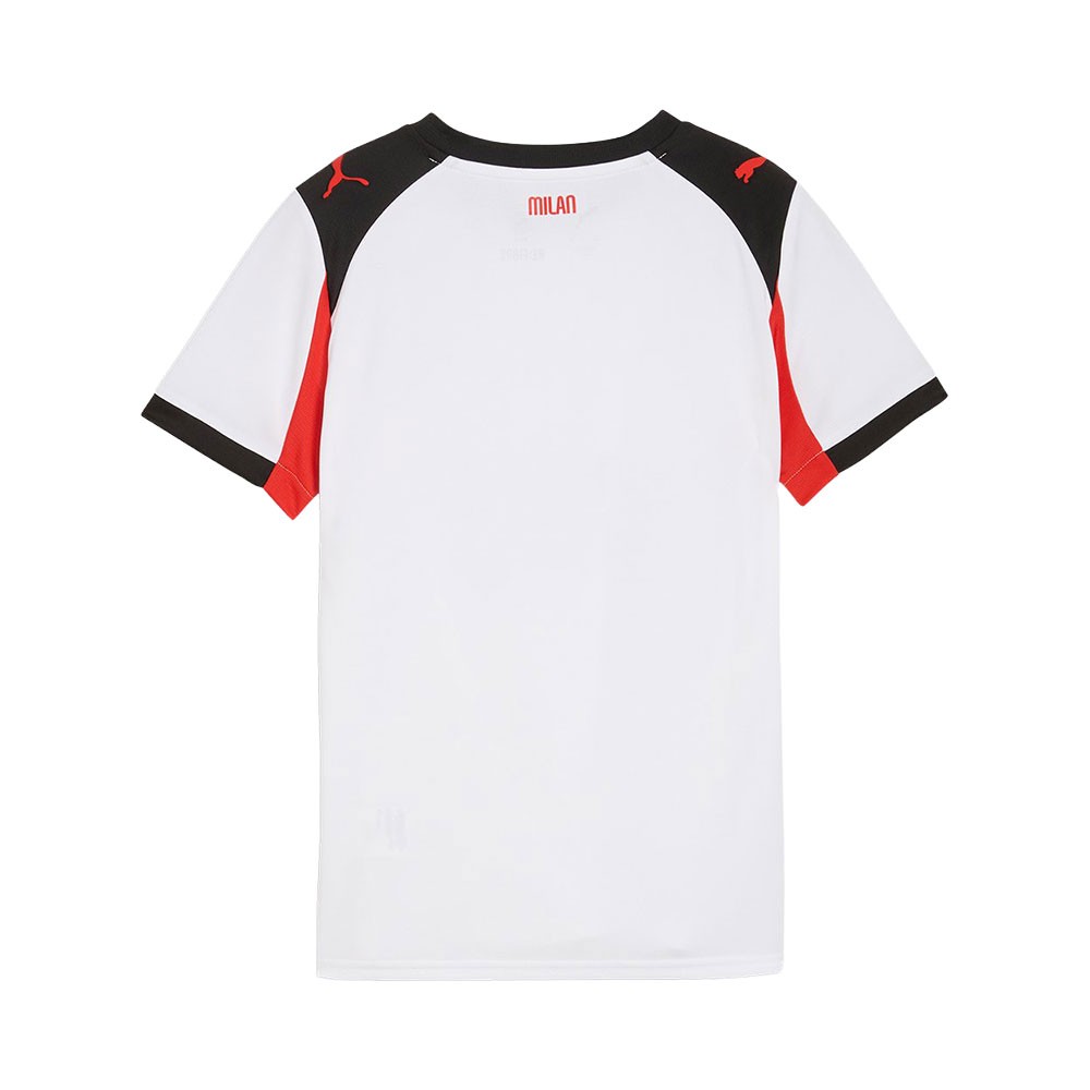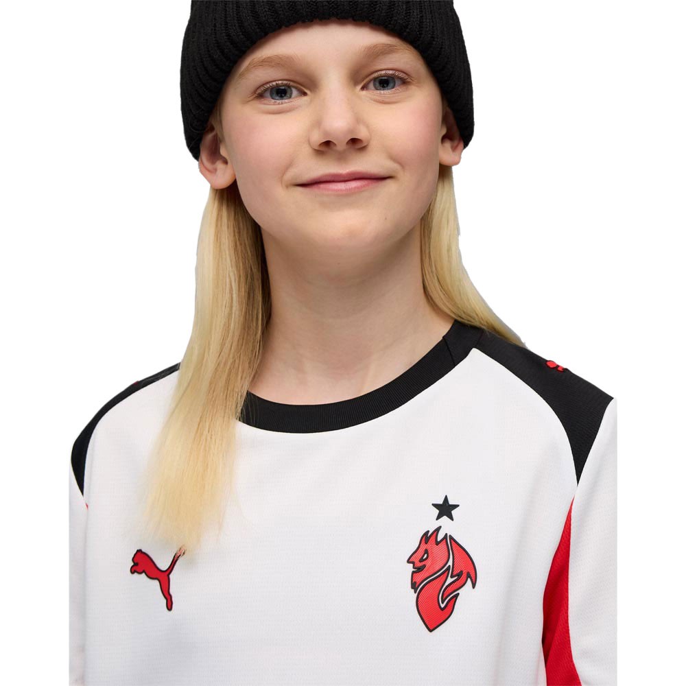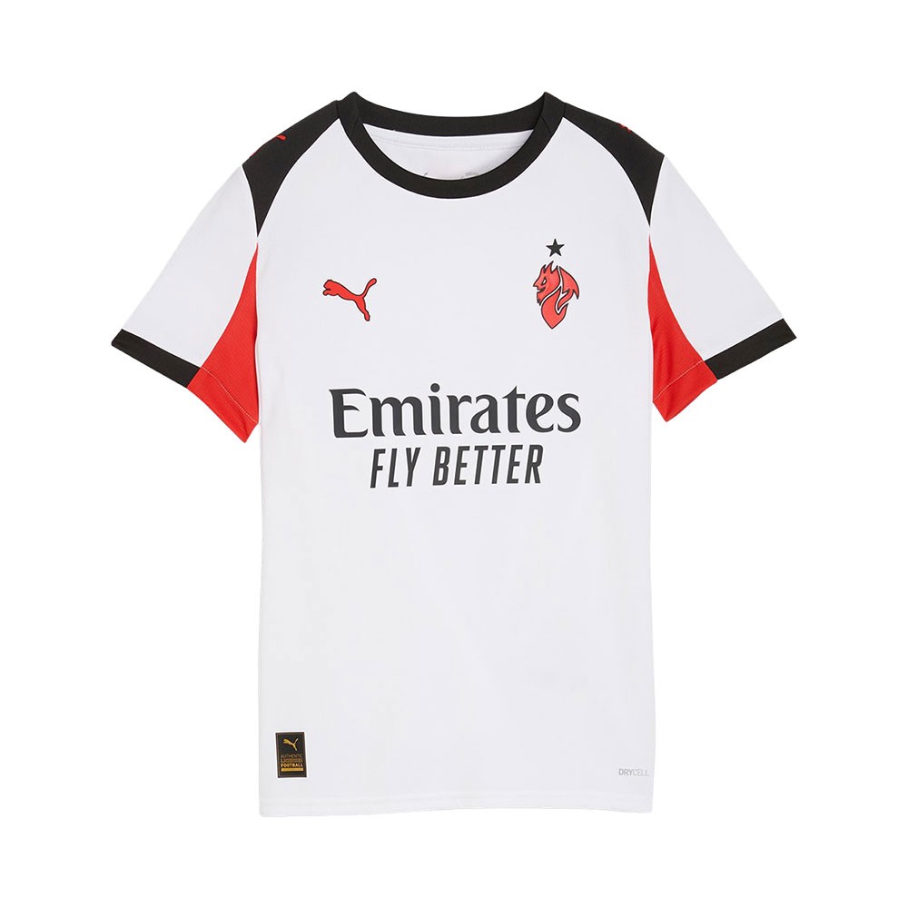 La maglia calcio Puma AC Milan Away 25-26 incarna l'anima del club con un design pulito ma distintivo. Ideale per i giovani tifosi, offre comfort e prestazioni grazie alla tecnologia Drycell e allo stemma del Milan sul petto. Supporta la tua squadra con stile e passione. Logo dello sponsor Emirates Fly better e logo Puma Cat.