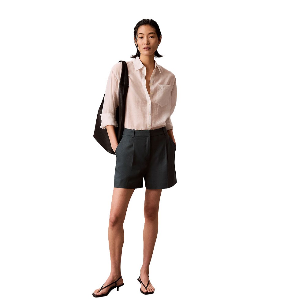 Pensata per un guardaroba estivo raffinato ed essenziale, questa bermuda Calvin Klein in misto lino e viscosa unisce leggerezza naturale e stile minimalista in un design pulito. La vestibilità regular, le pinces sul davanti e le tasche con bottoni sul retro aggiungono cura nei dettagli, mentre la chiusura con zip e gancio completa un capo versatile per look casual e smart casual.