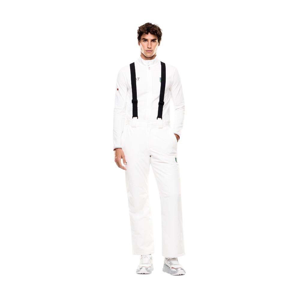 Prestazioni al top con i Pantaloni sci EA7 U Olympic Team bianchi. Realizzati in Protectum7 4way stretch, offrono impermeabilità (20.000mm) e massima libertà di movimento. L'imbottitura Stratum7 Recycled assicura termoregolazione ottimale. Ricchi di dettagli tecnici come pettorina removibile, ghetta interna e ginocchia preformate, sono la scelta ufficiale per sciare con comfort e stile italiano.