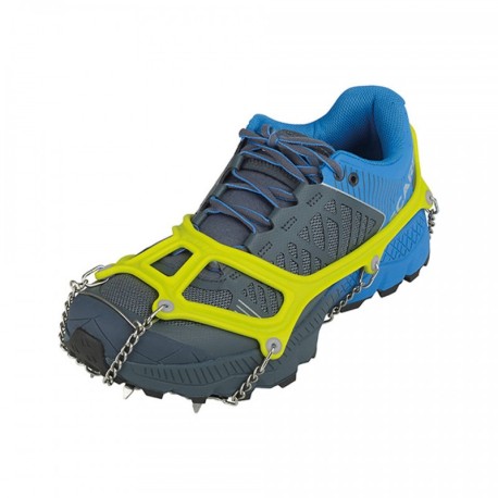 Ramponcini Camp minimal ma performante, studiato appositamente per il winter running. Con le sue 13 punte in acciaio inossidabile insieme alle catene di collegamento, garantiscono un’eccezionale robustezza e durata, una presa sicura e una trazione precisa su neve, ghiaccio o comunque su fondi a bassa aderenza (fango, erba bagnata, rocce lichenose ecc.).