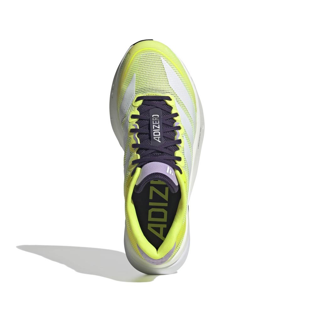 Le ADIDAS Adizero Boston 13 solar giallo footwear bianco abbinano tomaia in mesh ultraleggero a intersuola Lightstrike e LightstrikePro per movimenti dinamici, con Energyrod 2.0 in fibra di vetro per maggiore spinta e suola Lighttraxion con gomma Continental nella zona di spinta per grip e stabilità anche alle alte velocità.