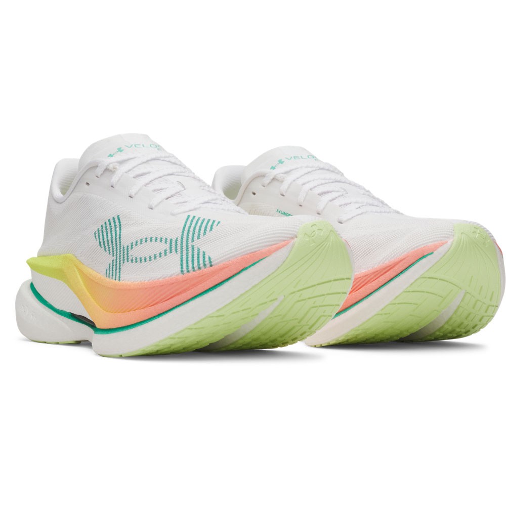 L’ammortizzazione UA Flow, priva di gomma, mantiene la scarpa leggera e ben aderente al suolo, mentre l’intersuola Supercritical ultra reattiva assicura una corsa fluida e dinamica su superfici asciutte.