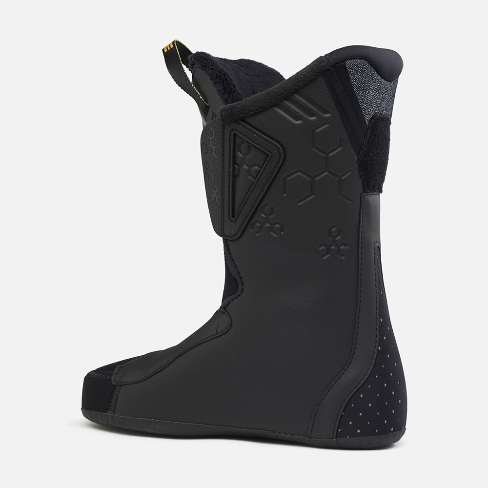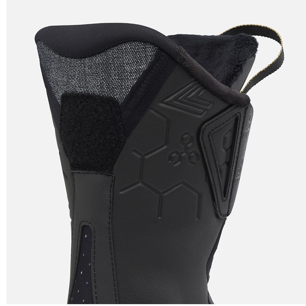 La flessione progressiva e l’assorbimento delle vibrazioni garantiscono un contatto più diretto con la neve, mentre lo scafo con design specifico per donna assicura una posizione più naturale e confortevole. La fodera termoformabile con puntale asimmetrico elimina i punti di pressione, offrendo una calzata uniforme e stabile per tutto il giorno.