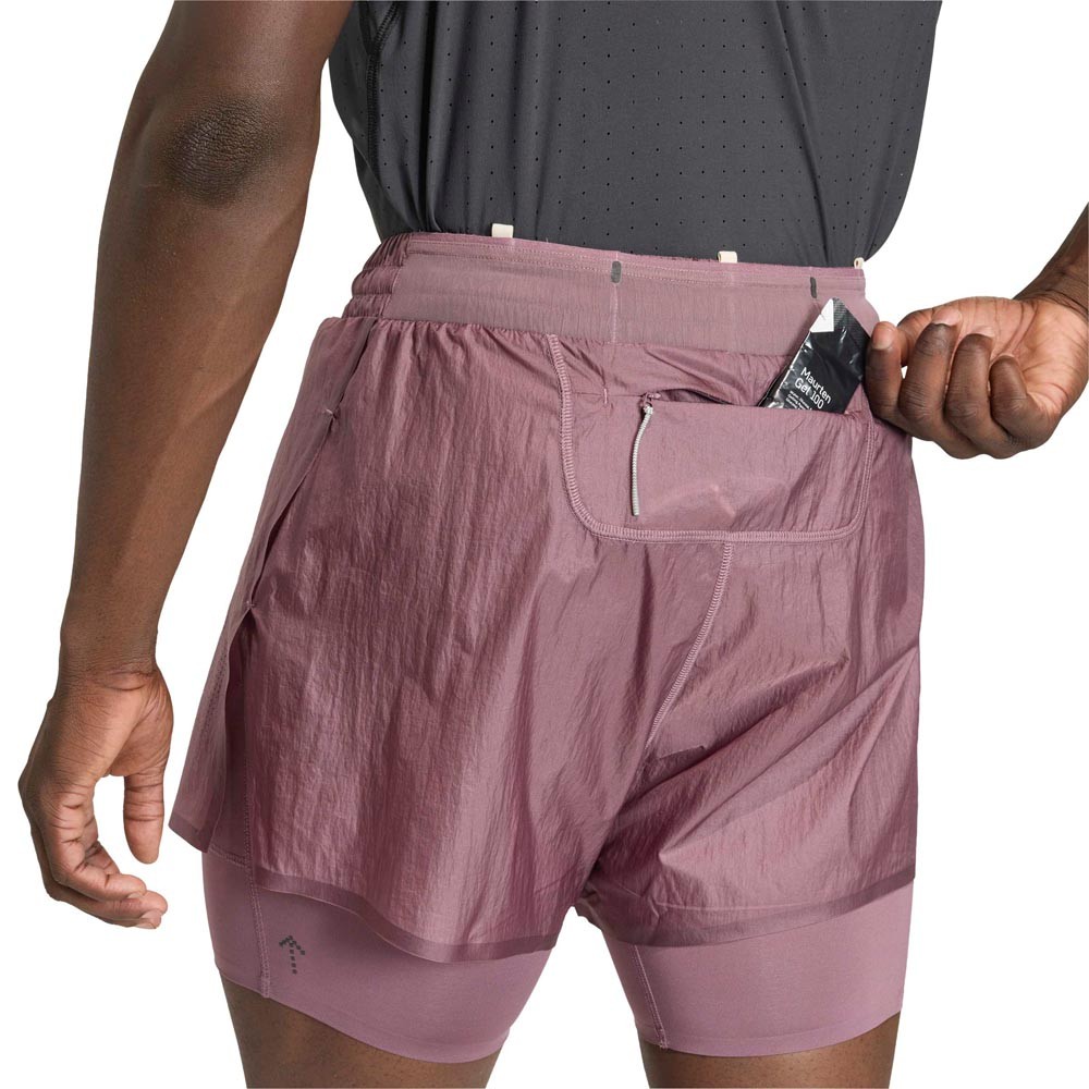 Questi pantaloncini running combinano un esterno ampio in poliammide riciclata a un tight interno di supporto per un mix di comfort e stabilità. Il girovita elasticizzato con cordino e finitura a coste offre una tenuta sicura, mentre la tasca posteriore con zip, la tasca laterale e il taschino interno per telefono e chiavi organizzano gli essenziali. Dettagli riflettenti e branding della collaborazione completano un look audace e funzionale.