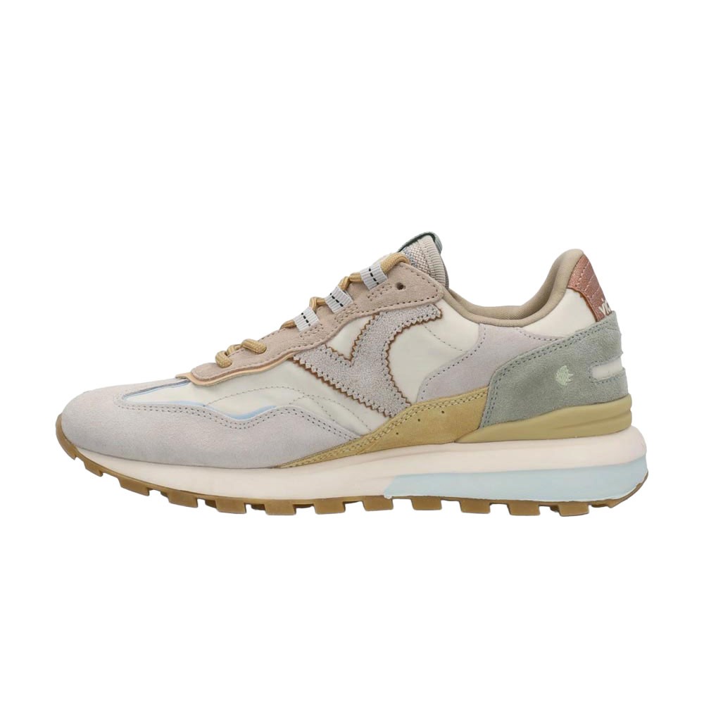 Sneakers Victoria Luna Nylon Beige Argento è la scelta giusta se cerchi una sneaker comoda e facile da abbinare. La tomaia in nylon con inserti in pelle scamosciata e dettagli multicolor è valorizzata dall’iconica V laterale, mentre soletta e fodera in tessuto avvolgono il piede. La chiusura con lacci e la suola in TPR in rilievo garantiscono stabilità e grip, e il caratteristico profumo Victoria aggiunge una piacevole nota sensoriale ad ogni passo.