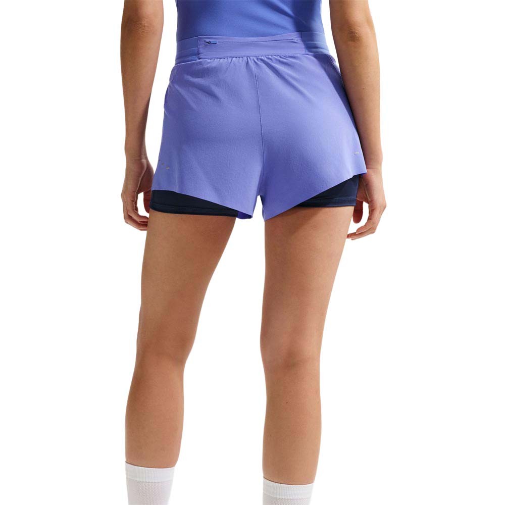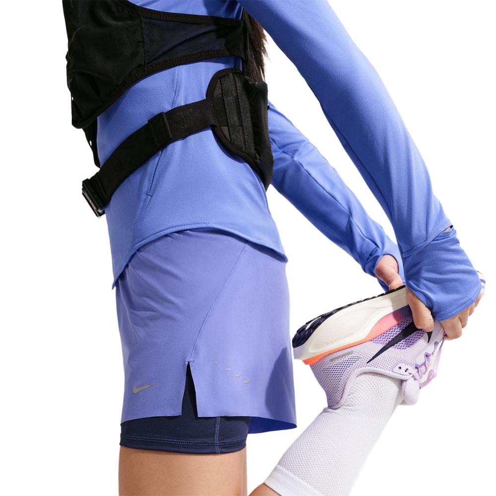 Pantaloncini running Nike Swift 2 in 1 sapphire da donna, vita media, interni aderenti e strato esterno ampio per copertura, comfort e spazio extra. Pantaloncini running Nike Swift 2 in...
