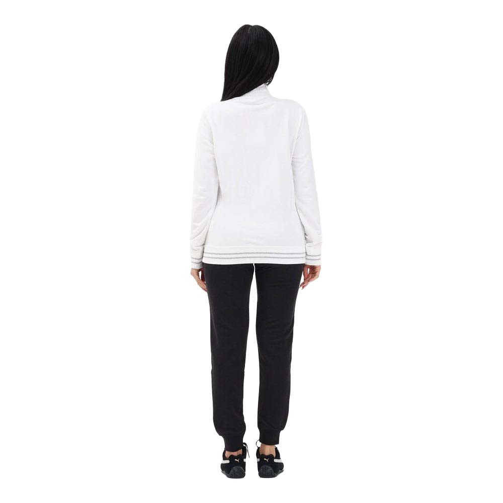 Perfetta per un look casual dinamico e di carattere, questa tuta sportiva Puma Strass unisce una felpa bianca con chiusura full zip collo alto e dettagli a righe sui polsini e sul fondo a un jogger nero con elastico in vita e caviglie per un abbinamento sporty chic raffinato. Il logo discreto sulla gamba completa un completo versatile e moderno per ogni giornata.