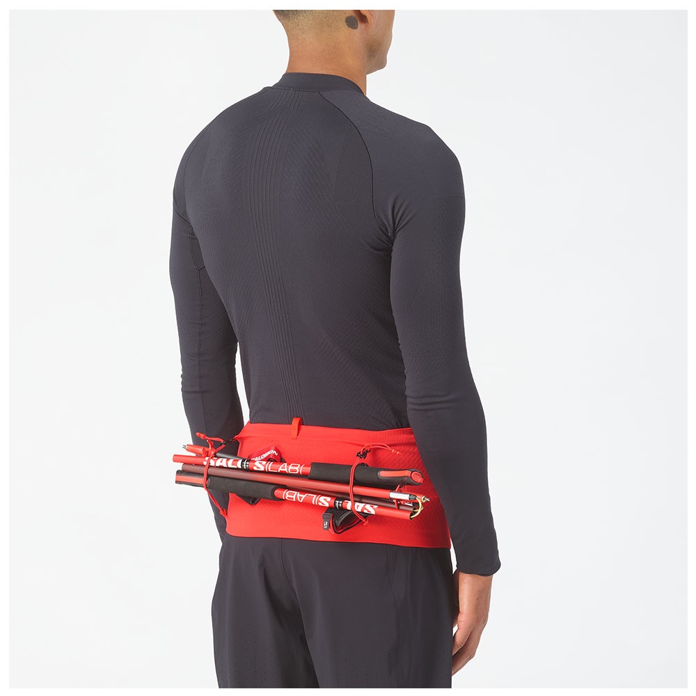 La tasca stretch a 360° permette un accesso rapido a tutto ciò che serve: flask, gel, smartphone o una giacca leggera. Le cinghie regolabili consentono anche il trasporto dei bastoncini, rendendola una soluzione pratica e versatile per ogni uscita.